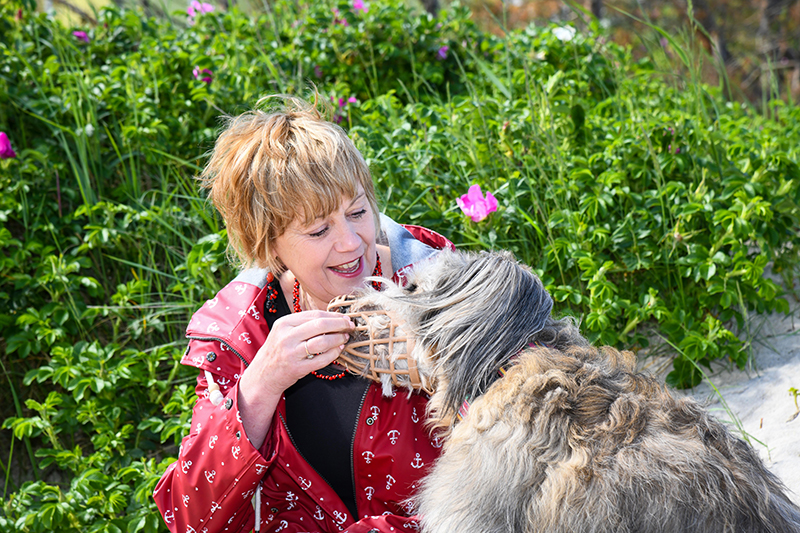 Natürlich ist das neue Ding auf der Nase zunächst ungewohnt für Rosa. „Der Maulkorb muss zu einem alltäglichen Zubehör werden“, erklärt die Expertin. Und dementsprechend agieren wir nun. Das Anlegen wird zu einem ganz normalen Vorgang, wie das des Halsbands und der Leine. Ich bleibe dabei gelassen und fröhlich. Das ist wichtig, denn wenn der Halter schon mit einer schlechten Stimmung herangeht und den armen Hund bedauert, überträgt er diese Haltung automatisch auf das Tier.