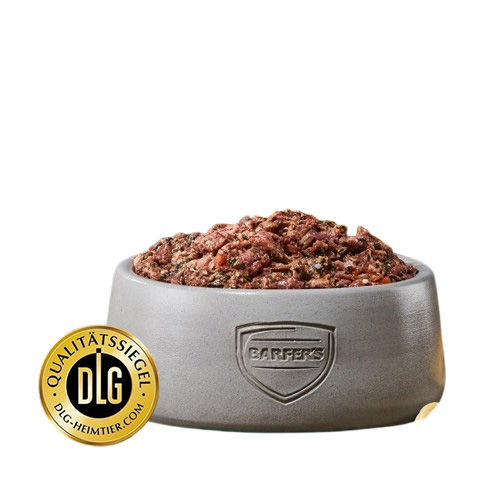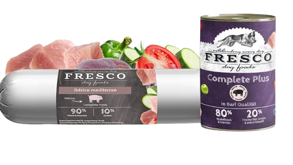 saugut verträglich. Gibt´s als BarfWurst Ibérico mediterran mit 90 Prozent Fleisch und Innereien sowie 10 Prozent Gemüse oder, dampfgegart und in der Dose, das Nass-Barf Complete Plus Ibérico mit 80 Prozent Fleisch und Innereien sowie Gemüse, Obst und einer Kombination aus Weizenkeim-, Lachs- und Sonnenblumenöl. https://www.fresco.dog