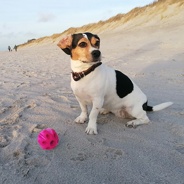 Jagen liegt dem Jack Russell-Beagle-Mix im Blut. Deshalb muss ihr Jagdtrieb artgerecht umgelenkt werden. Leider ist Jacky seit jeher auf Bälle fixiert und eine wilde Sau, wenn es ums Fangen und Bringen gibt. Bisher hat sie jedes runde Spielzeug entweder kaputt gemacht oder im Wasser versenkt. Ihr größtes Glück ist es, im Sommer in den See zu springen und etwas zu apportieren. Die Beute wird dann gerne im Sand mit den Zähnen bearbeitet – was bisher immer das Ende für jedes Spieli bedeutet hat. Sie testet den Healthy Ball & Cord.